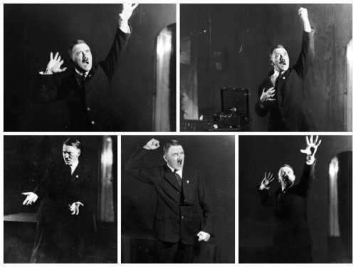 Эти невероятные фотографии были сделаны Генрихом Гофманом (Heinrich Hoffmann). На них видно как Гитлер репетирует, слушая запись одной из своих речей. Фотографии были сделаны в 1925 году, вскоре после того, как его выпустили из тюрьмы после девятимесячного заключения, в ходе которого он продиктовал свою автобиографию «Моя борьба» (Mein Kampf).