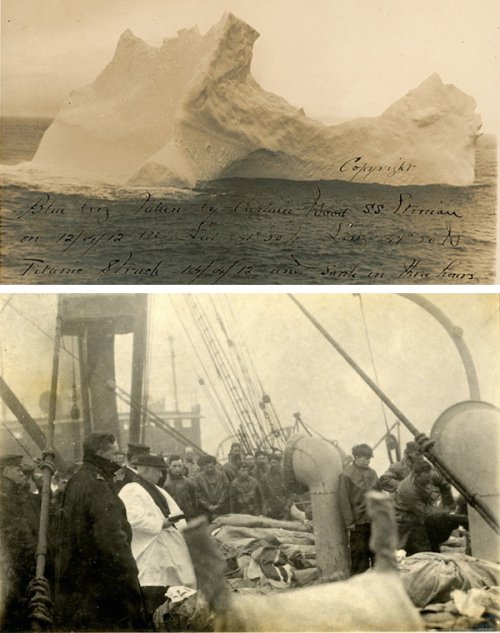 На первом снимке виден возвышающийся айсберг, "жутко похожий" на тот, который был изображён в эскизах двух членов экипажа злополучного лайнера. Фотография была сделана Вудом, капитаном другого судна, Etonian, за два дня до катастрофы "в месте, от которого до появления на пути Титаника айсберг бы плыл около 2-3 дней".