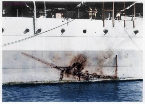Результат неудавшегося тарана британского тяжёлого крейсера "Сассекс" (HMS Sussex) самолётом Ki-51 с пилотами-смертниками (камикадзе).