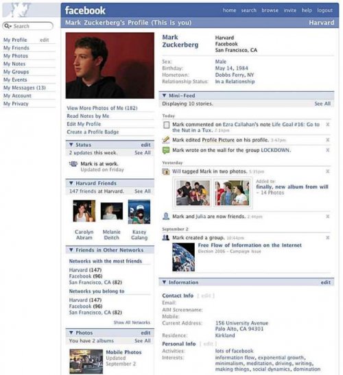 Профиль Марка Цукерберга в Facebook в 2007-ом году.