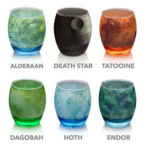 Этот комплект из шести бокалов в виде небесных тел из нескольких эпизодов фантастической саги "Star Wars" создан для настоящих поклонников киноэпопеи: Альдераан, Дагоба, Хот, Татуин, Эндор и Звезда смерти. Созданные компанией "Think Geek", эти могущественные кубки объёмом 10 унций (около 284 мл) помогут вам утолить жажду. Побалуйте свою тёмную сторону — отпразднуйте этот Новый год в стиле джедая!