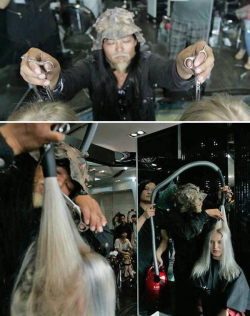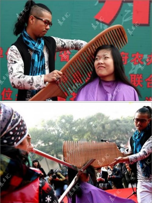 10. Китайские парикмахеры, которые используют гигантскую расческу и большие ножницы для стрижки волос