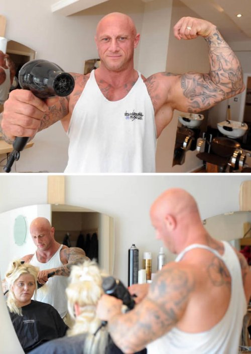 Этот парень разительно отличается от обычных парикмахеров! Саймон Акройд (Simon Ackroyd) проводит свои дни в салоне красоты, работая парикмахером, а ночью тренируется в тренажёрном зале. 45-летний мужчина, который потребляет целых 6000 калорий в день, стрижёт волосы уже в течение 30 лет и занимается бодибилдингом в течение 18 лет.