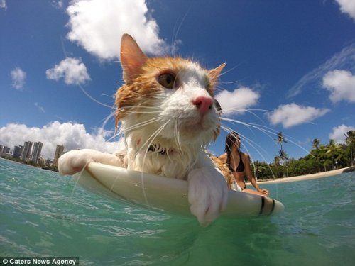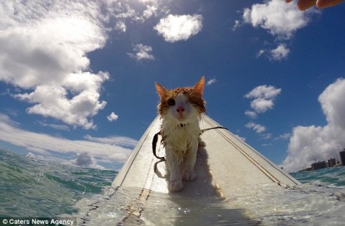 Александра Гомес (Alexandra Gomez), его новая 25-летняя хозяйка из Гонолулу (Гавайи), подобрала бездомного котёнка, когда он был совсем маленьким и весил чуть меньше 500 граммов. Спустя время малыш окреп, и уже в 4 месяца научился плавать и кататься на доске для сёрфинга.
