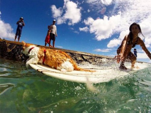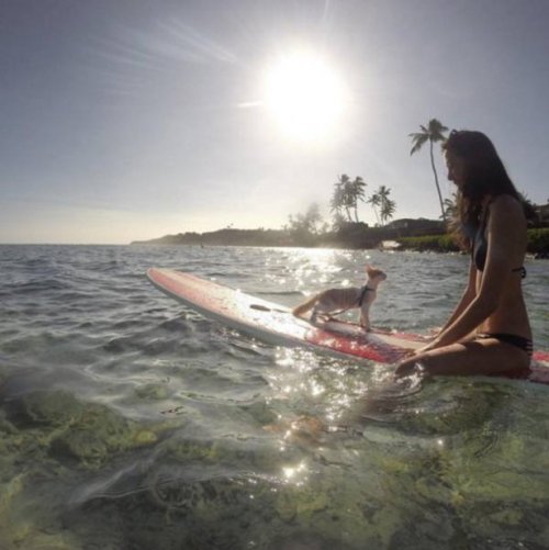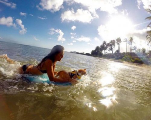 Впервые Кули встал на доску для сёрфинга год назад, и теперь этот замечательный найдёныш любит проводить время со своей новой хозяйкой, катаясь на гавайских волнах.