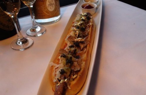 Хот-доги — самая популярная на бейсбольном стадионе и невероятно дешёвая еда. Самый дорогой хот-дог продаётся в ресторане "230 Fifth" в Нью-Йорке. Это блюдо длиной около 30 см готовится с мраморной говядиной Вагю с добавлением чёрных трюфелей. Всё это подаётся в сладкой булке бриошь, смазанной трюфельным маслом, а также органическим кетчупом и горчицей, импортируемых из Франции. Сверху булка посыпается луком, карамелизированным в шампанском "Dom Perignon" и бальзамическом уксусе стоимостью 389 долларов за бутылку. Кроме лука в блюдо добавляется квашеная капуста, приготовленная с дорогостоящей осетровой икрой. Всё это украшается съедобным тонким листовым золотом. Один хот-дог стоит 2300 долларов, а прибыль с продажи идёт на благотворительные цели в организацию "City Harvest", деятельность которой направлена на кормление голодных.