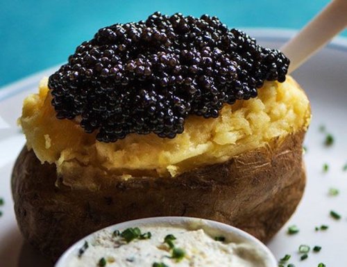 К блюду подаётся перламутровая ложка. За этот печёный картофель придётся выложить 460 долларов, на которые можно было бы заказать несколько ужинов со стейками с печёным картофелем в большинстве традиционных мясных ресторанов.