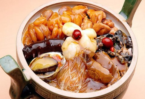 Суп готовится из плавника акулы, морских ушек, грибов сиитаке, морского огурца, сушёных гребешков, курицы, ветчины Хуан, свинины и женьшеня. Чтобы отведать этот суп, за 5 дней до посещения ресторана нужно сделать предварительный заказ и быть готовым раскошелиться на $190.