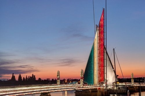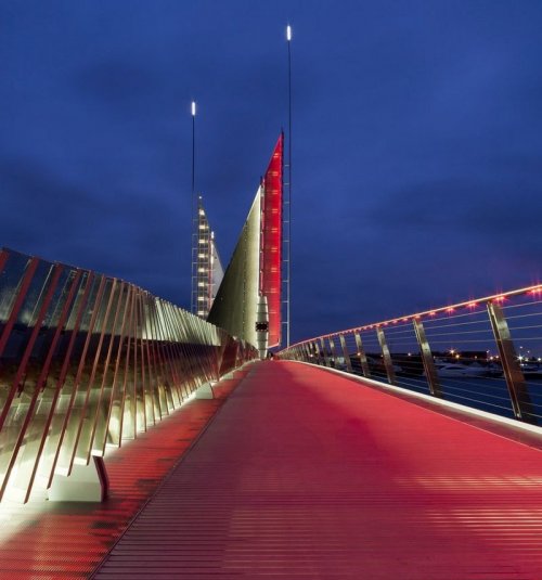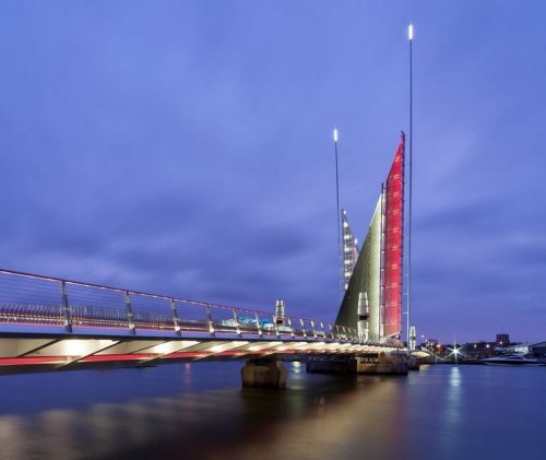 В закрытом положении мост ничем не отличается от других, но когда два пролёта моста поднимаются вверх, чтобы открыть путь проплывающим по каналу суднам, два его полотна треугольной формы напоминают паруса яхты.