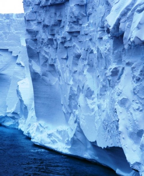 То, что выглядит как гигантский ледяной замок, вздымающийся из моря, на самом деле является поразительным примером редкого явления, известного как голубой лёд. Это явление заключается в том, что пузырьки льда сжимаются и абсорбируют свет в красной части спектра, благодаря чему ледяные массы становятся голубого цвета.