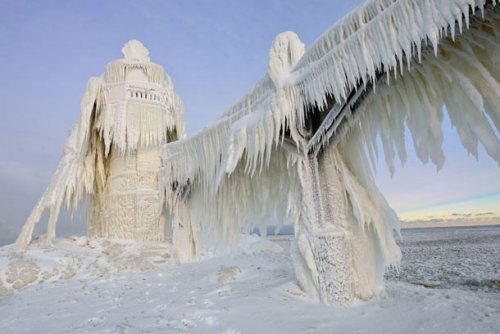 Бураны, характеризующиеся очень холодным дождём и сильным ветром, могут создавать невероятные ледяные скульптуры, окутывая деревья и другие объекты твёрдым покрывалом льда. Один из таких творческих буранов создал эту ледяную статую на маяке святого Иосифа (St. Joseph Lighthouse) в штате Мичиган.