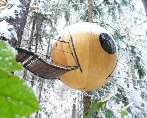 Необычные дома построил парень по имени Том Чадлей (Tom Chudleigh). Сферы выполнены из деревянного каркаса, затянутого кожей, покрытой эпоксидной смолой. И да, в них можно жить. В каждый сферический дом проведено электричество, есть кровать, раковина, холодильник и микроволновка.