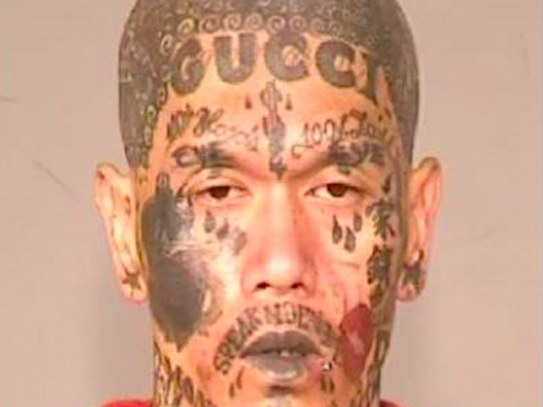На полицейском снимке видно сильно татуированное лицо со свастикой на лбу и надписью "Иисус Христос", нарисованной поперёк щеки.