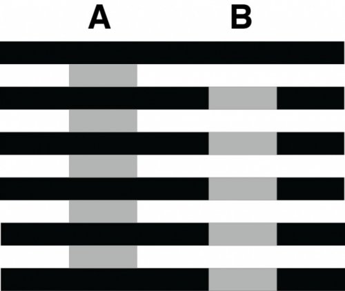 Глядя на картинку, кажется, что вертикальные полосы имеют разный оттенок серого, однако это не так — они совершенно одинакового цвета. Такая иллюзия создаётся благодаря соседству с линиями чёрного и белого цвета.
