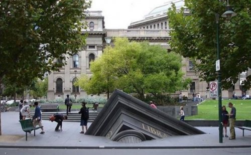 За пределами Государственной библиотеки Виктории существует множество "тонущих" статуй, однако "тонущее здание" в Мельбурне можно смело назвать лучшей из них!