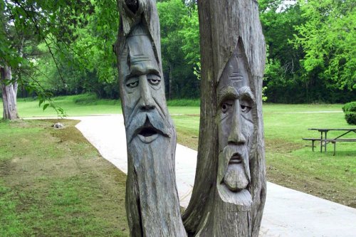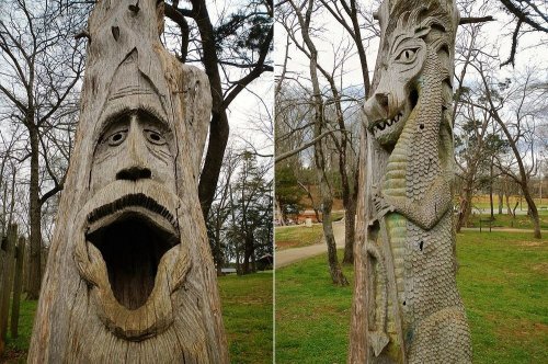 Вдоль пешеходной дорожки в парке Орр в городе Монтевалло (штат Алабама, США) можно увидеть более 30 резных деревьев. Они были вырезаны местным художником Тимом Тинглом (Tim Tingle).
