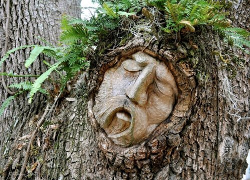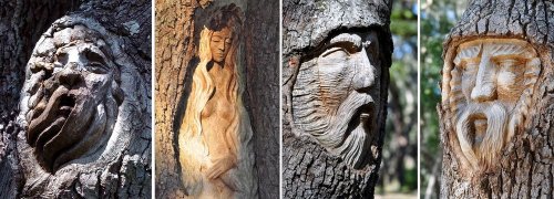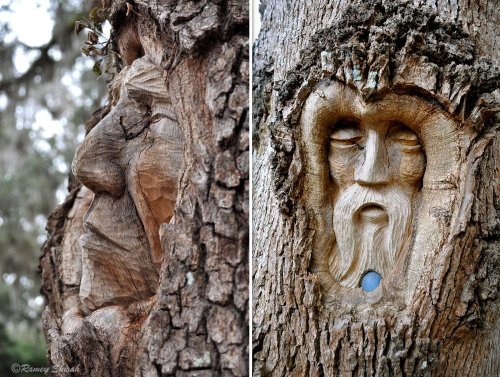 Эти резные лица на старых дубах на острове Сент-Симонс в штате Джорджия созданы местным художником Китом Дженнингсом (Keith Jennings) в память о погибших моряках, плававших на могучих парусниках, построенных из дуба, растущего на острове. В окрестностях этого небольшого прибрежного города можно увидеть 15 таких резных лиц.