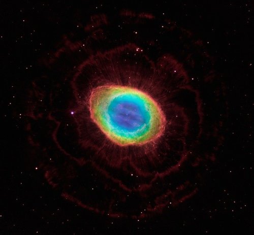 10. Образовавшаяся в результате взрыва звезды, похожей не Солнце, туманность Кольцо (Ring Nebula) — это красиво светящиеся слои газа и остатки сброшенной атмосферы бывшего красного гиганта. Всё, что осталось от звезды — это маленькая белая точка в центре изображения.