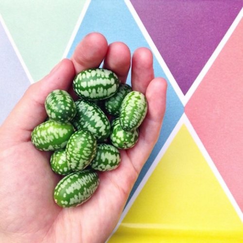 Эти необычные плоды по-английски называют "cucamelon", что является сочетанием слов "cucumber" ("огурец") и "watermelon" ("арбуз"). И вправду, плоды мелотрии шершавой (Melothria scabra), на вид похожие на арбузы, по своему вкусу напоминают огурцы. Некоторые их так и называют — арбузные огурцы, хотя наиболее распространённое общепринятое название — мексиканские кислые корнишоны.