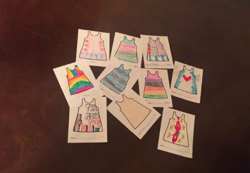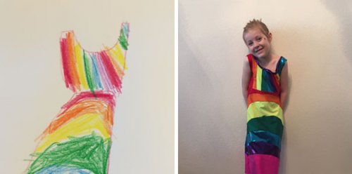 Любой желающий заходит на специальный веб-сайт, выбирает размер и распечатывает лист выкройки для раскрашивания. После того как ребёнок раскрасит его по своему желанию, изображение отправляется на веб-сайт, и через две недели готовое платье приходит по почте. Вот несколько счастливых обладательниц платьев, сшитых с их индивидуальными рисунками.