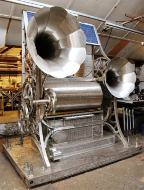 Когда питающийся от солнечной энергии цилиндр поворачивается, поднимается рычаг, перебирающий струны. Затем питание передаётся перемычке, которая усиливает звук с помощью большого рупора.