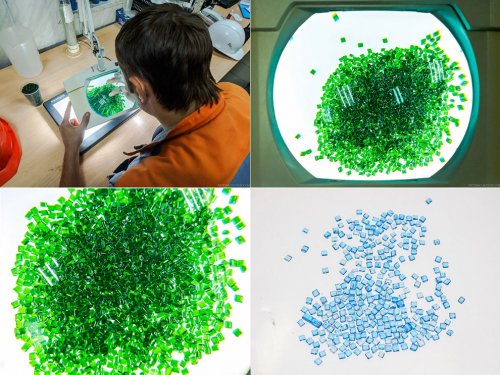 Бутылочные хлопья проходят процедуру финальной индуктивной металлосепрации, после чего специальный компьютерный станок отбирает бракованные флексы другого цвета.