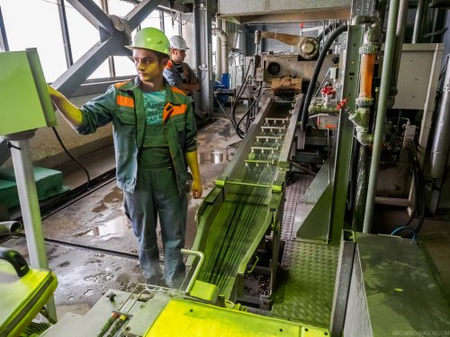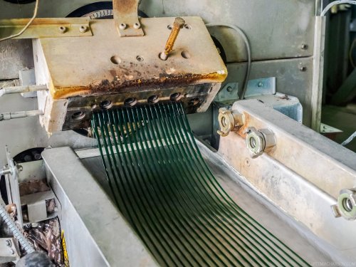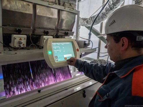 Процесс в третьем цеху состоит из нескольких этапов. Во-первых, повторное металлоотделение, потом предварительный разогрев, удаление ацетальдегида и других вредных примесей, фильтрация. Сначала хлопья режутся в измельчителе, после чего флекс плавится при температуре 280 градусов Цельсия.
