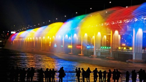 Мост-фонтан "Лунная радуга" находится в Сеуле, Южная Корея. Струи воды, бьющие по сторонам, делают его похожим на радужный водопад.