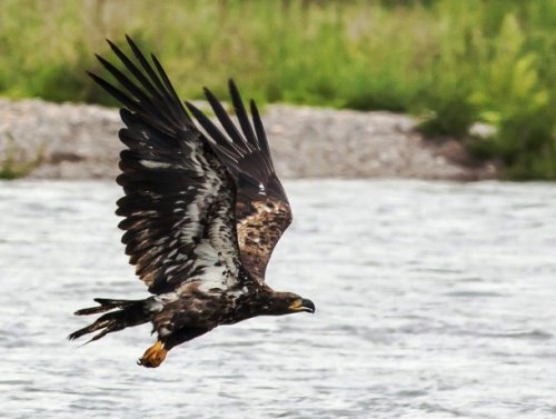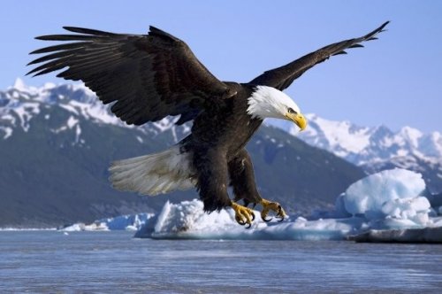 Отличающаяся огромным жёлтым клювом, эта птица в основном охотится на рыб и водоплавающих птиц. Её любимым лакомством являются лосось и форель.