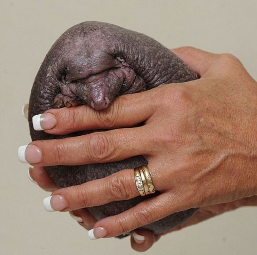 "Мы, вероятно, никогда не узнаем, по какой причине он лишился своего волосяного покрова и шипов, – говорит менеджер центра спасения Foxy Lodge Тоня Гарнер (Tonia Garner). – Он для нас вообще загадка, поскольку для того, чтобы дожить до взрослых лет, у него должны были быть колючки, а состояние его здоровья очень хорошее, кроме того факта, что он лысый".