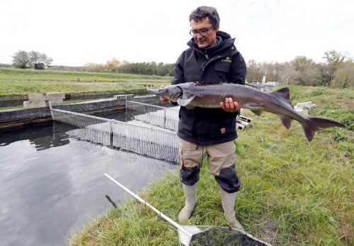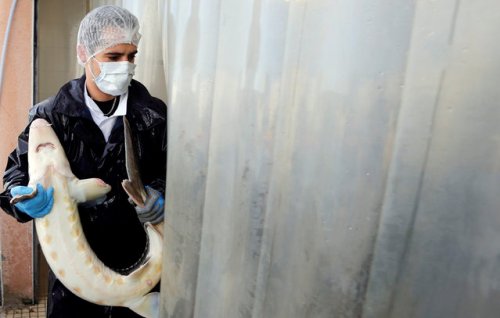 Работник держит самку осетра на ферме по разведению рыбы и производству икры компании "Sturgeon” ("Осетрина"), ведущего французского производителя,, в Сен-Жени-де-Сентонжа, Франция, 8 ноября 2016 года. (Фото: Реджис Дювино/ Рейтер)