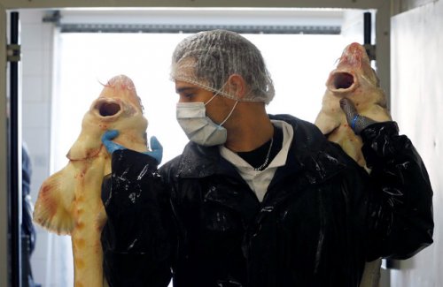 Работник собирает зернистую икру из забитой самки осетра на ферме по разведению рыбы и производству икры компании "Sturgeon” ("Осетрина"), ведущего французского производителя, в Сен-Жени-де-Сентонжа, Франция, 8 ноября 2016 года. (Фото: Реджис Дювино/ Рейтер)