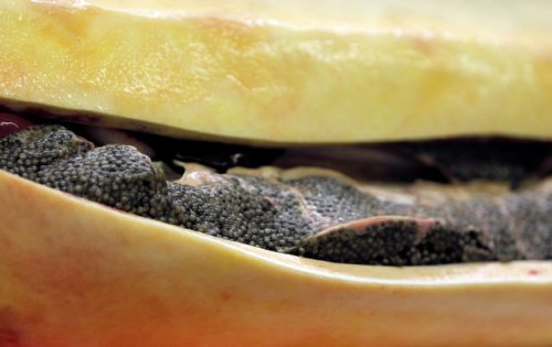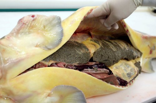 Икра внутри самки осетра на ферме по разведению рыбы и производству икры компании "Sturgeon” ("Осетрина"), ведущего французского производителя, в Сен-Жени-де-Сентонжа, Франция, 8 ноября 2016 года. (Фото: Реджис Дювино/ Рейтер)