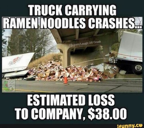 Лапша была доставлена на местную свалку, однако эта авария считается легендарной, поскольку породила мем, расположенный выше. ("Авария грузовика, перевозившего лапшу "Рамэн", принесла компании потери в размере 38 долларов")