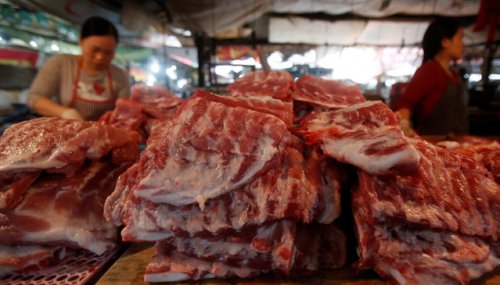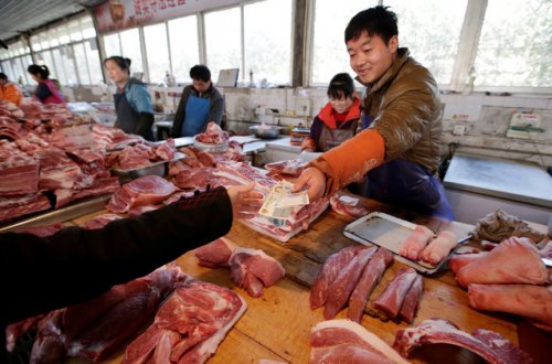 Мясник, продающий свинину, возвращает сдачу покупателю на рынке в Пекине, Китай, 25 марта 2016 г. (фото: Jason Lee/Reuters)