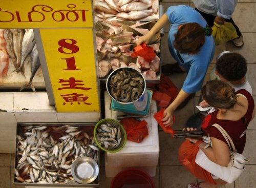Люди покупают рыбу на рынке живой продукции в Сингапуре, 23 марта 2016 г. (фото: Edgar Su/Reuters)