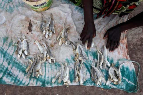 Женщина раскладывает сушёную рыбу на ткани на рынке в Серекунде, Гамбия, 3 декабря 2016 г. (фото: Thierry Gouegnon/Reuters)