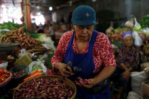 Женщина перекладывает лук на своём прилавке на рынке Кебайоран Лама в Джакарте, 30 ноября 2016 г. (фото: Reuters/Beawiharta)