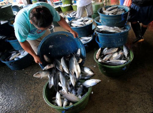 Торговец вываливает ведро рыбы для продажи на местном рынке живой продукции в порту Навотас, 30 декабря 2016 г. (фото: Romeo Ranoco/Reuters)