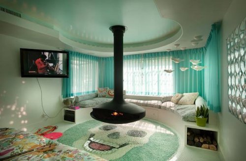 Дома в Оклахоме солист группы Flaming Lips Уэйн Койн (Wayne Coyne) создал для себя особенный интерьер. Стилизованный камин, словно парящий над поверхностью, нависает над полом, вручную выложенным плиткой. Как вы видите, из мозаики были собраны не цветочки и завитушки, а изображение черепа.