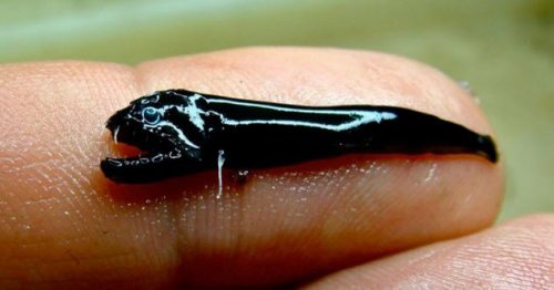 Крошечная, блестящая, бесчешуйная чёрная рыба выглядит, как миниатюрное нефтяное пятнышко. Обнаруженная в окрестностях четырёх древних вулканов у побережья Австралии, эта рыба имеет непропорционально большие, довольно пугающие челюсти и зубы.