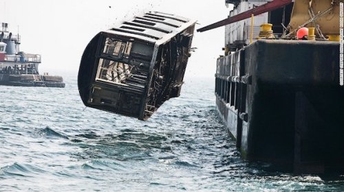 После того, как 2500 вагонов метро были отозваны с эксплуатации, их хорошенько почистили, и все, что только можно было демонтировать (сидения, колеса, ремни), было продано или переработано. Затем вагоны погрузили на баржу, которая отвезла их к точке сброса в море, где они послужат каркасом для создания подводного рифа. Риф станет домом, в котором смогут поселиться ракообразные и рыбы из Атлантического океана.