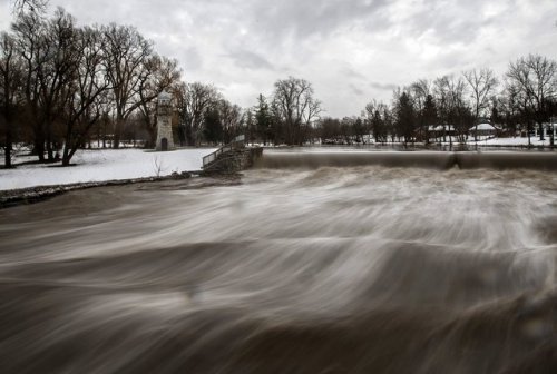 4. Вода американского ручья Каюга мчится вслед за грандиозным снежным штормом в Ланкастере, Нью-Йорк, 24 ноября 2014 года. Работники службы спасения наполнили песком тысячи мешков, чтобы оградить район Баффало искусственной дамбой, и спасти окрестные города от возможного наводнения из-за сильного таяния снега. В тот год за довольно короткий период здесь выпало около 2 метров осадков. Фото: Mark Blinch/Reuters