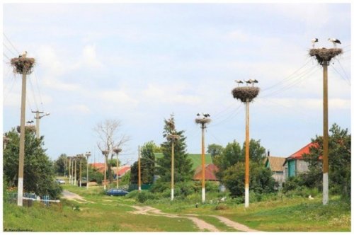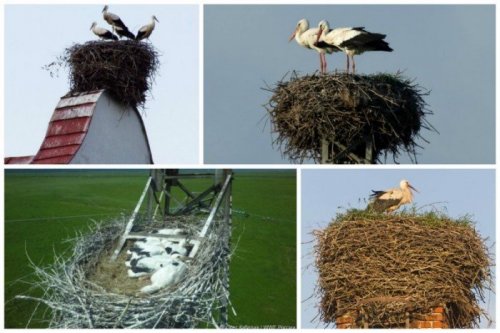 Гнёзда аистов, которые можно увидеть повсеместно: на крышах домов, на опорах линий электропередач, на трубах домов — поближе к людям.
