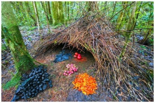 Шалашники расчищают территорию и строят из веток шалаш, который украшают чем-то ярким: ягодами, камушками, цветками и даже мусором.
