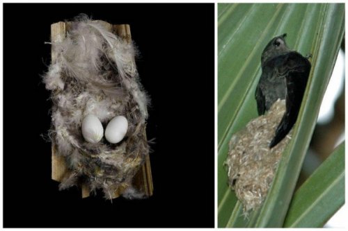 Пальмовый стриж приклеивает с помощью слюны перья к пальмовому листу. К перьям они также приклеивают яйца, а затем вылупившиеся птенцы цепляются за подстилку, прижимаясь грудью к листу.