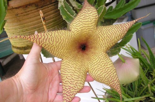 Stapelia gigantea более известна как цветок-падальщик или цветок-морская звезда. Это растение очень похоже на кактус с большим соцветием, которое достигает до 30 см в длину. Чаще всего встречается цветок-падальщик коричневого или темно-бордового оттенков, и его лепестки на ощупь напоминают замшу или кожу животных. Обычно цветы привлекают своим сладким запахом всевозможных насекомых (пчел, например), которые опыляют и распространяют пыльцу дальше по полям, но со stapelia gigantea дела обстоят иначе. Для привлечения внимания опылителей эта наземная морская звезда испускает другой не менее интересный для некоторых насекомых аромат – запах гниющей плоти.