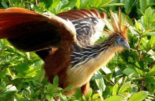 Хоатзин в народе так и называют – вонючая птица. Она проживает в тропических лесах Эквадора и по описанию местных жителей воняет, как коровий помет или сено. Хоатзин выглядит и пахнет очень необычно, да еще и питается одними листьями. Оперенье у нее коричневое, черное или белое, мордочка ярко-голубого цвета, а голову украшает гребешок, очень похожий на ирокез. Хоатзины плохо летают, но отлично плавают и карабкаются по деревьям, собираясь в стаи примерно по 10 особей.