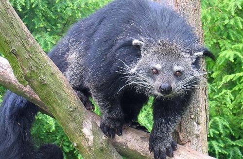 Это милое животное обычно встречается черного или темно-коричневого цвета с белыми и серебристыми пятнышками или полосами. Кошачий медведь любит прятаться в ветвях плодовых деревьев и поедать там фрукты. Пахнет это животное довольно необычно – приготовленным на масле попкорном или мускусом. Причиной этому аромату является пахучий секрет цибетин, который этот зверек использует для пометки своей территории. Так что если этот запах покажется вам приятным, не стоит полагать, что это приглашение к знакомству. Напротив, бинтуронг таким образом предупреждает вас, что вы вторглись в его земли.