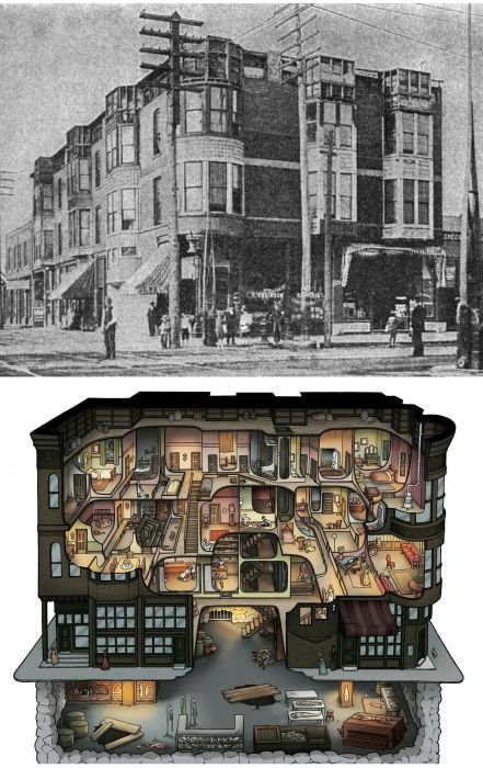 Фотография и схема смертельного отеля Г.Г. Холмса (H. H. Holmes), здания, специально предназначенного для убийств. В нём были газовые камеры, комнаты пыток, тайные проходы, опускные двери и печи. По некоторым оценкам, в этом здании погибло 50-350 человек.